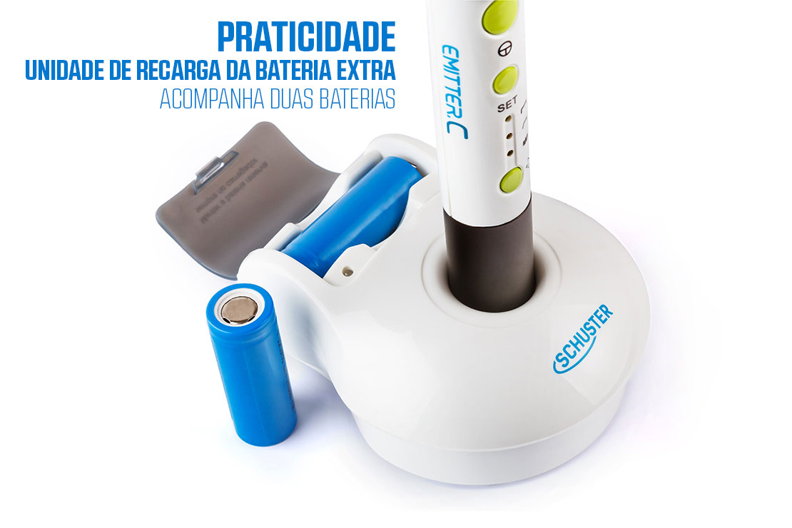 Vantagens: – O equipamento sempre estará apto para sua utilização, pois não há necessidade de o fotopolimerizador ficar na base para que a bateria seja carregada. Maior vida útil do equipamento.