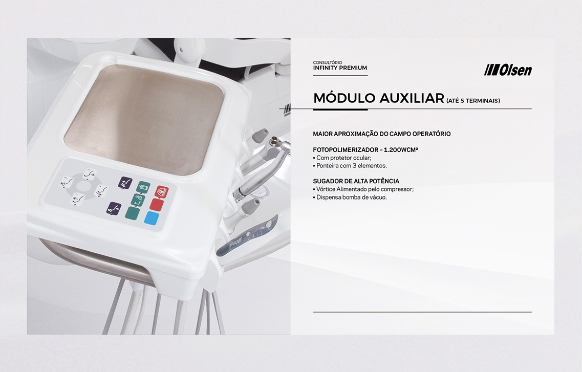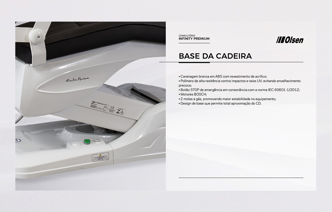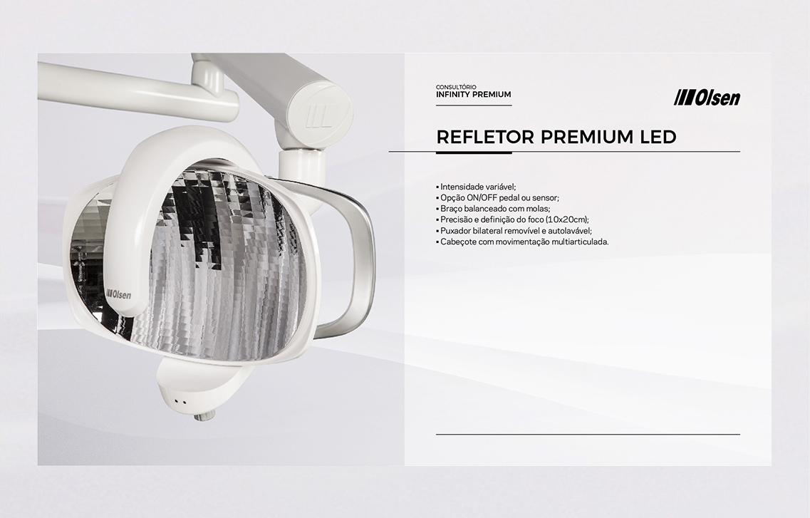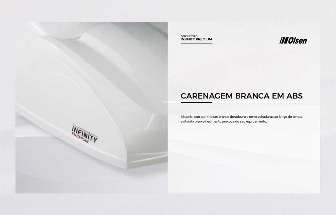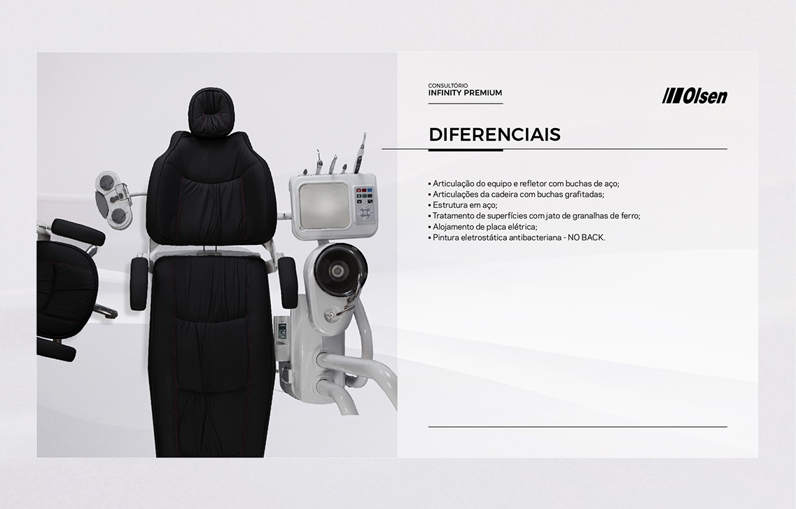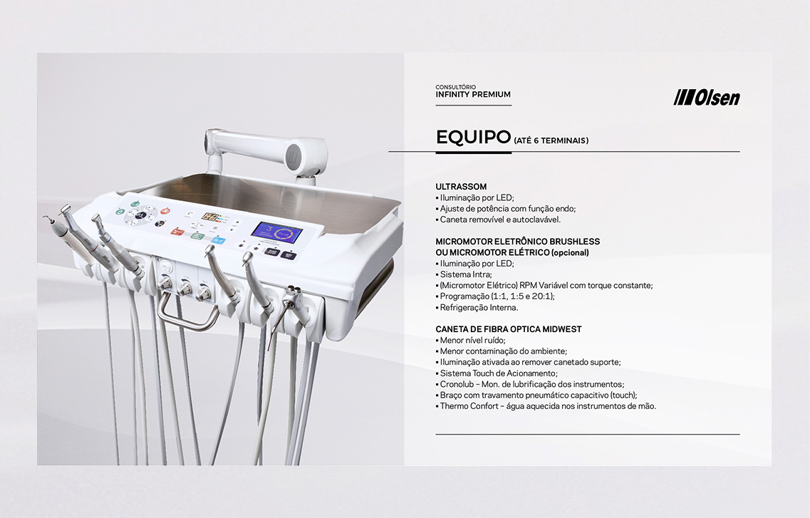 O sonho de consumo de todo Dentista! O Infinity Premium Pro é o equipamento mais completo da Olsen. Este modelo concede à você o título de especialista em conforto e bem estar ao paciente. Se você ainda quer mais, torne-se mestre em alta performance, usufruindo de modernos conceitos tecnológicos, ergonômicos e de biossegurança. *Registro ANVISA Nº 10281300009.