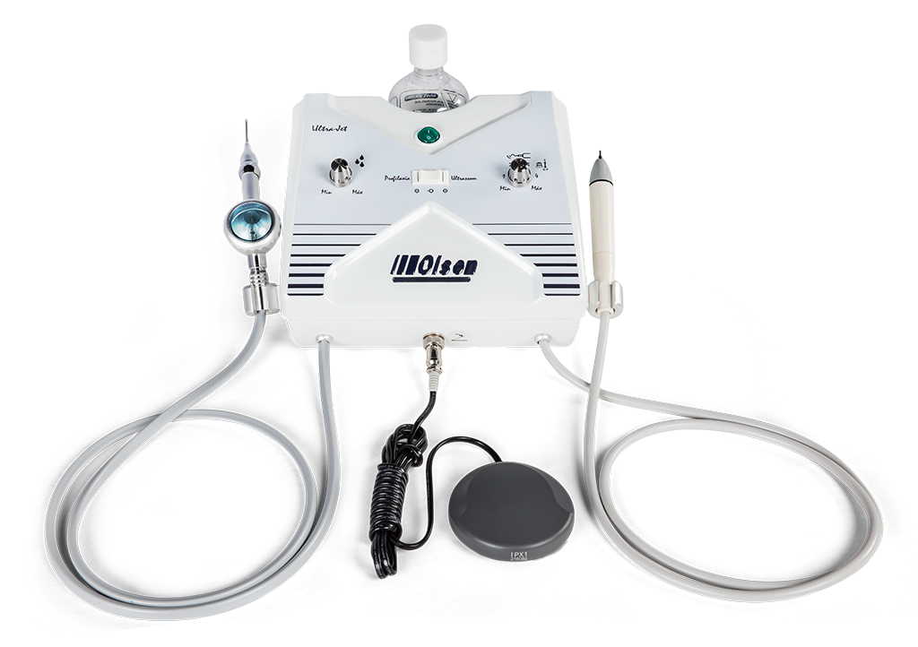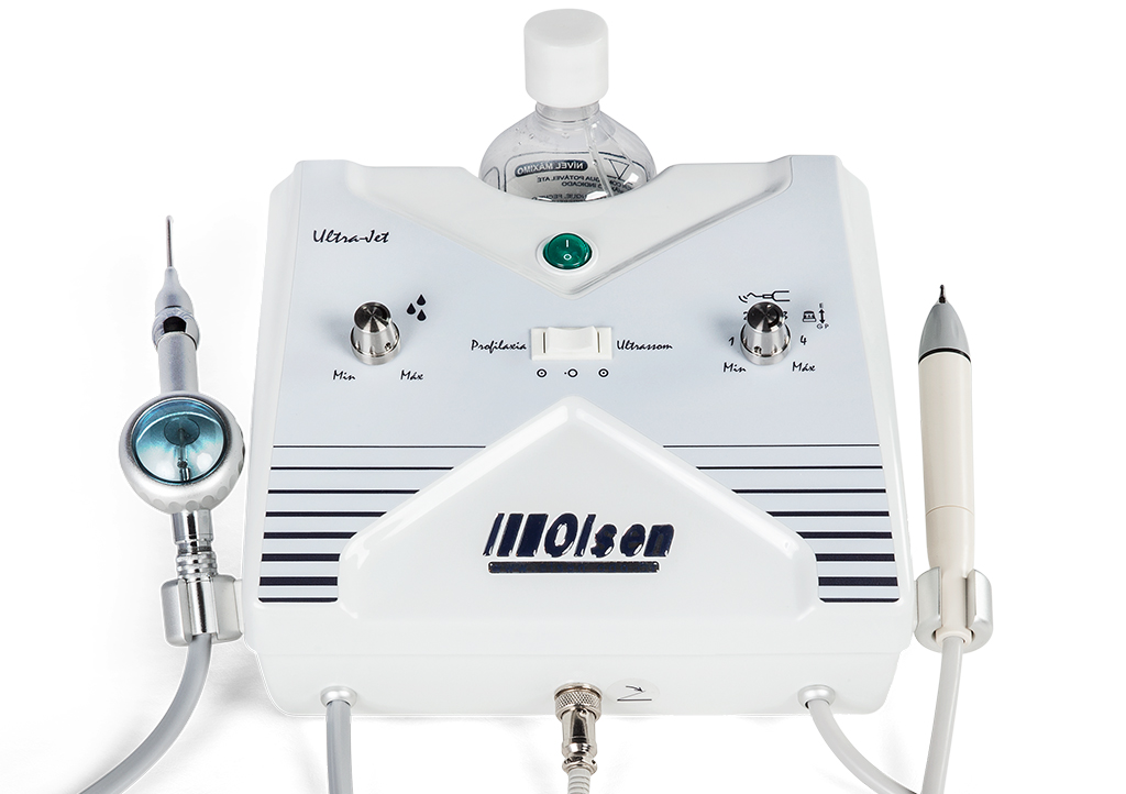 O Ultra-Jet apresenta uma chave para seleção do acionamento do ultrassom e do jato e bicarbonato. O sistema de ultrassom possui placa eletrônica de geração ultrassônica que, através de sistema piezoelétrico, proporciona a vibração da ponta, dando condição de alta frequência. Ao ser acionado através do pedal, o equipamento inicia a vibração da ponta, aciona o LED, inicia a atuação da bomba peristáltica e abre a passagem de água para refrigeração. A intensidade da vibração e o controle de volume de água para refrigeração podem ser ajustados através de controles individuais.